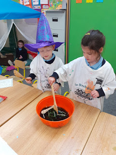 Something strange has been happening in Kilrickle these past 2 weeks! Our Junior and Senior Infants have all turned into witches as our classroom was turned into a Potions Lab! After reading Julia Donaldson's 'Room on the Broom' our little witches and warlocks have been making some disgusting potions and casting spells!